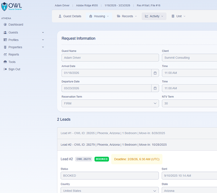 Temporary housing operations involve dozens of moving parts: guest needs, vendor coordination, apartment readiness, service delivery, and client communication. Many providers still rely on spreadsheets, disconnected tools, and manual follow-ups to manage it all. That approach creates risk. In an industry where sales cycles are long and the lifetime value of a single client can reach millions, one operational mistake or missed follow-up can damage the relationship and lead to client attrition. Athena replaces fragmented processes with a single operational system designed for the realities of corporate housing. By automating workflows and centralizing communication, Athena ensures that every task—from client request to post-move-out—is tracked, executed, and delivered with consistency.